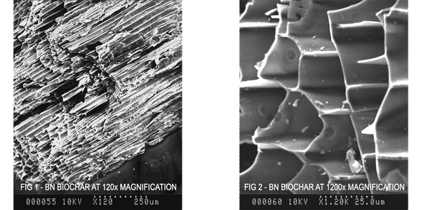 TimberChar™ Nutrient Harvesting filters, have been tested for water sequestration and found to hold 5.6 times its weight in water. The pores are very long compared with their openings. There is very little evaporation from the TimberChar™ . When roots do not consume the sequestered water, it is held for long periods of time. Greatly reducing the amount of watering needed.